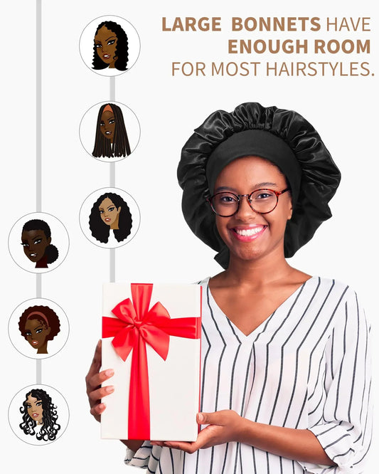 Satin Bonnet for Women Silk Bonnets for Sleeping Curly Hair Bonnet with Tie Band Double Layer Sleep Cap Hair Wrap 7-7 3/8 Black + Red Flower